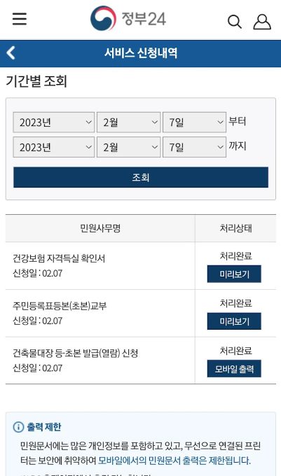 - 민원 검색 및 발급 신청, PDF 저장 후 출력 가능