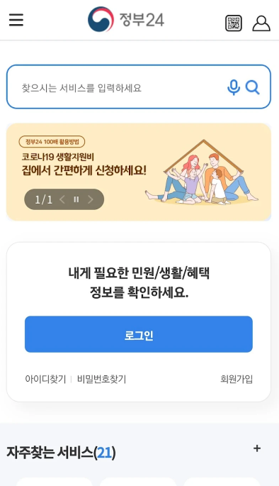 - 정부24 홈페이지(또는 정부24 앱)에 접속합니다.