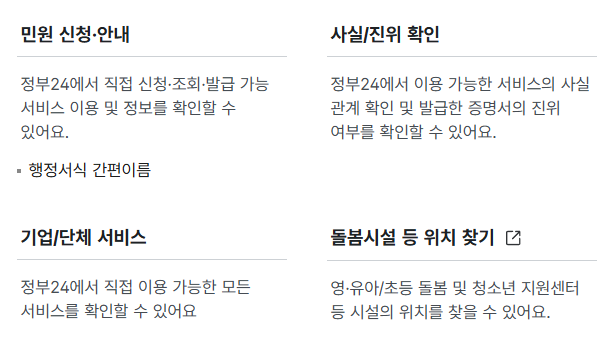 정부24에서는 다음과 같은 민원서비스가 제공됩니다. 과거 민원24에서 가능했던 모든 기능이 여기에 포함되어 있으며, 더 다양한 서비스도 제공되고 있습니다.